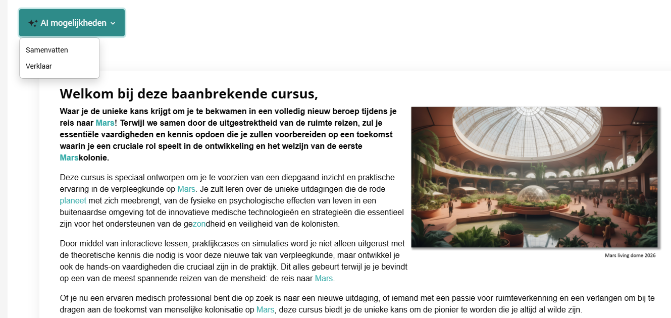 De AI-knop verschijnt boven de tekst binnen die activiteit of bron, mits de functie is ingeschakeld