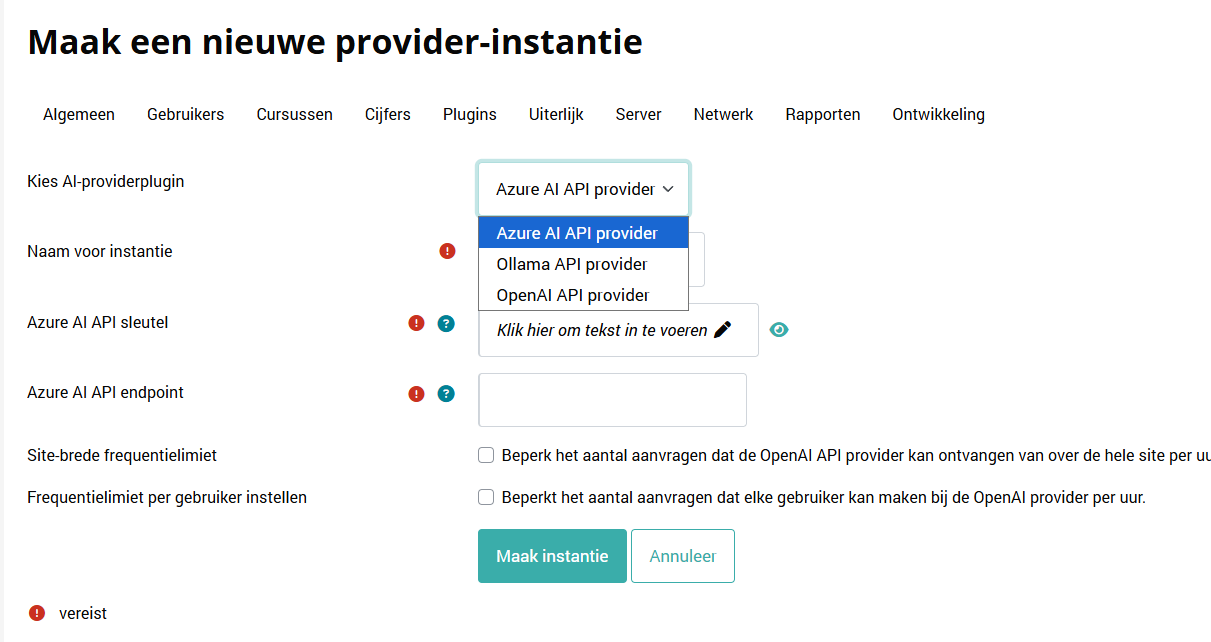 Met name via de nieuw te kiezen Ollama API ondersteunt Moodle™ ook het gebruik van lokaal gehoste AI‑modellen, waardoor instellingen meer controle houden over data, privacy en infrastructuur.