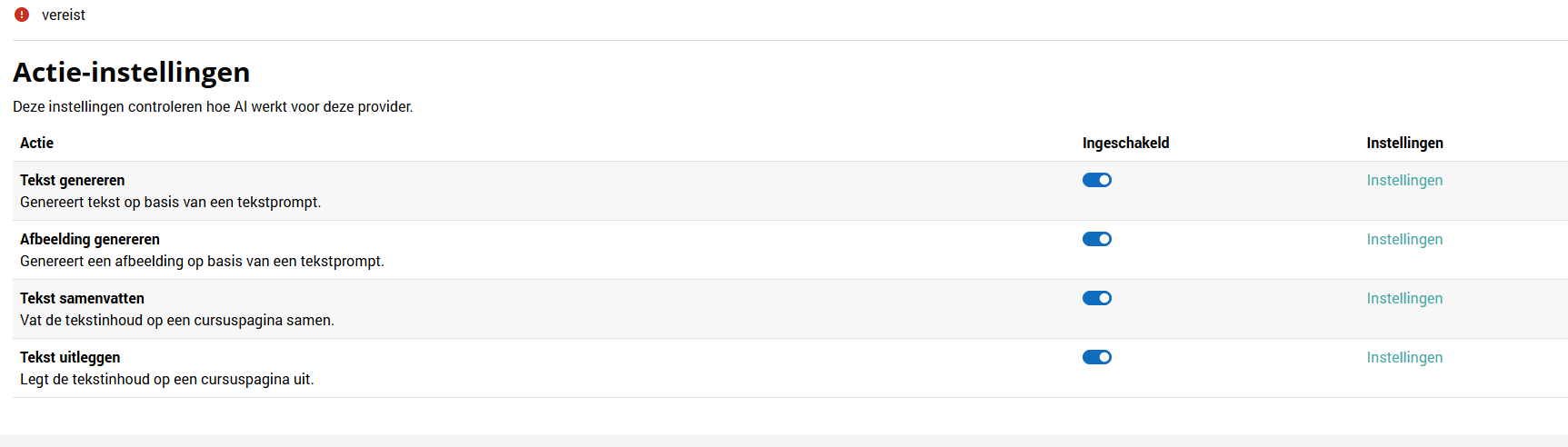 Je kunt bij elke provider uitkiezen welke actie deze kan uitvoeren. In Moodle 5.0 is er een nieuwe actie bijgekomen dat is "Tekst uitleggen"
