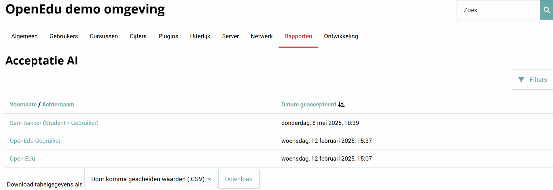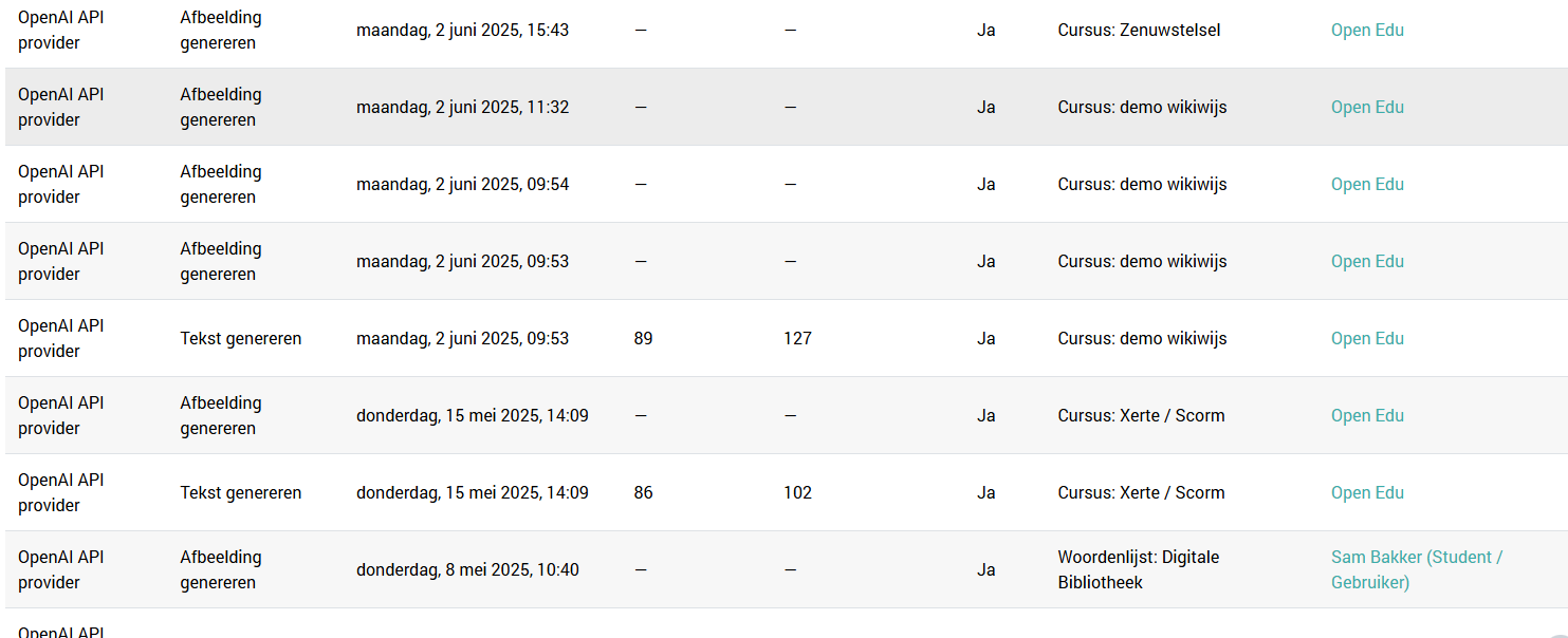 Naast acceptatie biedt Moodle™ 5.0 ook rapportage over het gebruik van AI. Beheerders krijgen inzicht in welke AI-acties zijn uitgevoerd, door welke gebruikers, binnen welke cursuscontext en via welke AI-provider. Deze rapportage maakt AI-gebruik transparant en ondersteunt zowel beleidsverantwoording als kosten- en gebruiksinzicht