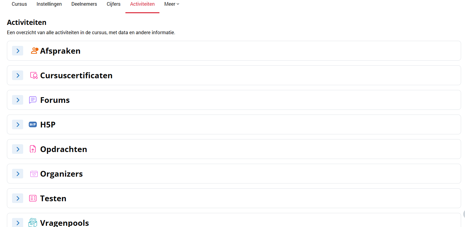 De Activities overview biedt studenten en docenten een centraal overzicht van alle activiteiten binnen een cursus. Activiteiten worden los van de cursusstructuur gepresenteerd, inclusief hun status. Dit ondersteunt studenten bij het plannen van hun leeractiviteiten en helpt docenten om snel inzicht te krijgen in de voortgang, zonder dat de cursusopzet aangepast hoeft te worden.
