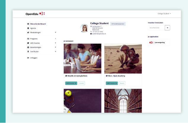Ondertussen worden in Moodle alle cijfers, feedback, opdrachten, badges en certificaten verzameld. Die resultaten worden vervolgens weer zichtbaar binnen het centrale educatie-overzicht in Odoo.